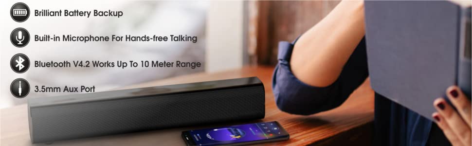 | Special Features | Crystal Clear Sound output of 10W, Extra Long battery life with 2000mAh battery, Ergonomic design, Piano Finish and 41 cm length makes it perfect for LED TV, 1-Year Manufacturer Warranty |